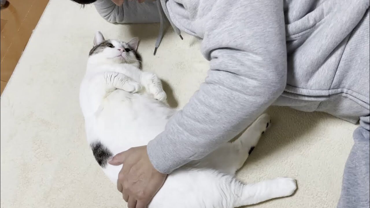 仰向けに寝転び、お父さんに優しくお腹を撫でてもらっているその姿は、まるでお父さんに甘える小さな子どものよう。なでなでされるのが本当に気持ちいいのか、時折うっとりと目を細めたり、手足を少し動かしたりする仕草がたまりません。