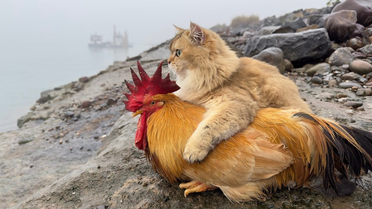 まるでおとぎ話の世界!仲良しな猫とニワトリが霧の中を一緒にお散歩する姿に癒やされる