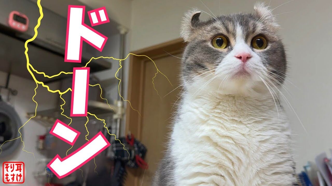 動画では、外で鳴り響く激しい雨と雷の音に、家の中の猫ちゃんたちも少し不安げな表情。そんな中、ひときわ強い雷鳴が響き渡った瞬間、一家の大黒柱であるもすけパパの耳が、見たこともないような「イカ耳」状態に!あまりの驚きに、パパとしての威厳もどこへやら、耳がピンと後ろに反り返ってしまった姿には、申し訳ないけれど思わずクスッとしてしまいます。