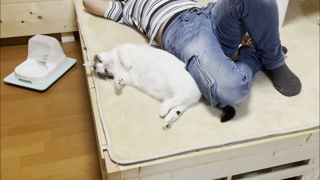 仰向けになって、お腹を大胆に見せながらぐっすり眠る姿は、まるで中に人間が入っているかのよう。 飼い主さんの足元で、無防備に足を投げ出してリラックスする様子に、思わず笑みがこぼれてしまいますね。 時には、キャットウォークの透明なボウルの中で、お肉がはみ出そうになりながらも器用に収まっている姿も。 そんな豆大福くんの「猫らしくない」けれど、とっても楽しそうな日常に癒やされます。