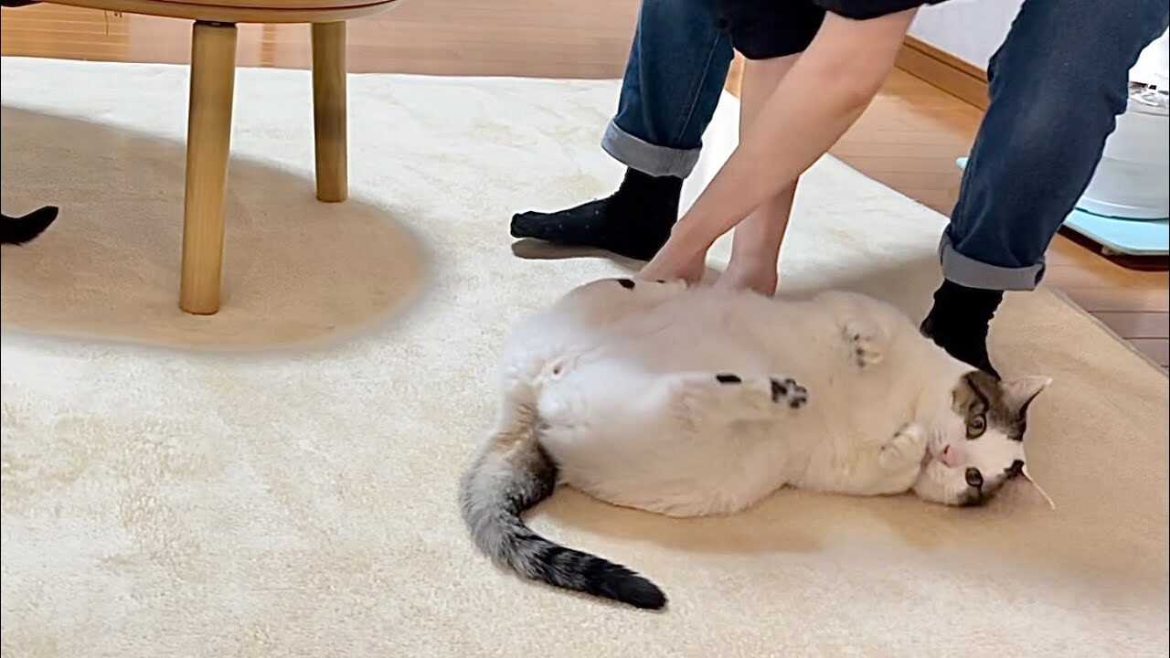 お母さんの手によって、まるでボールのようにゴロンゴロンと転がされる猫ちゃん。最初は「えっ、何が起きたの?」と戸惑っているようにも見えますが、その転がりっぷりが実に見事で、ついつい笑ってしまいます。当の猫ちゃんも、どこか「もっとやって!」と楽しんでいるようにも見え、お母さんとの信頼関係が伺えますね。