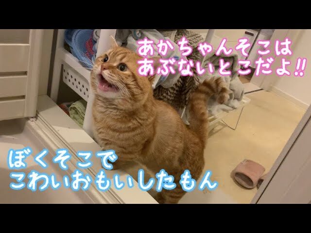 浴室の外でソワソワしながら待機する茶々さん。「大丈夫ー?」「何してるのー?」と問いかけるように、何度も可愛らしい声で鳴き続けます。扉の隙間から中を覗き込み、赤ちゃんの様子をうかがうその表情は、まるでお兄ちゃんや保護者のよう。