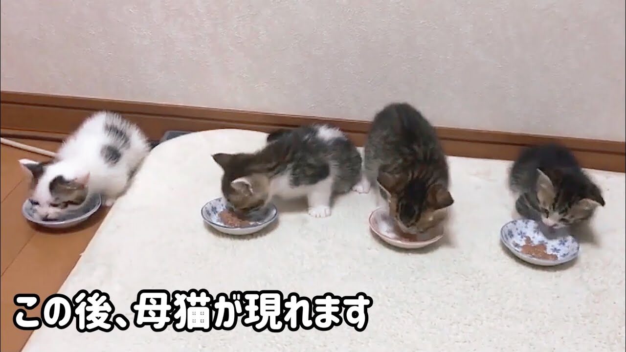 離乳食を前に、一生懸命お皿をなめる子猫たち。食べ終わるスピードはそれぞれで、中には遊び食べをしてしまう子も。そんな子猫たちの様子を優しく見守っているのが、母猫の「ひのき」ちゃんです。