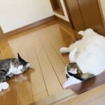 ベイリーくんの大きな体と、まだ小さな子猫たち。その対比が、命の尊さをより一層引き立てます。ベイリーくんが鼻先で子猫をクンクンしたり、母猫のそばでじっと寄り添ったりする姿は、まるで見守り隊の隊長のよう。
