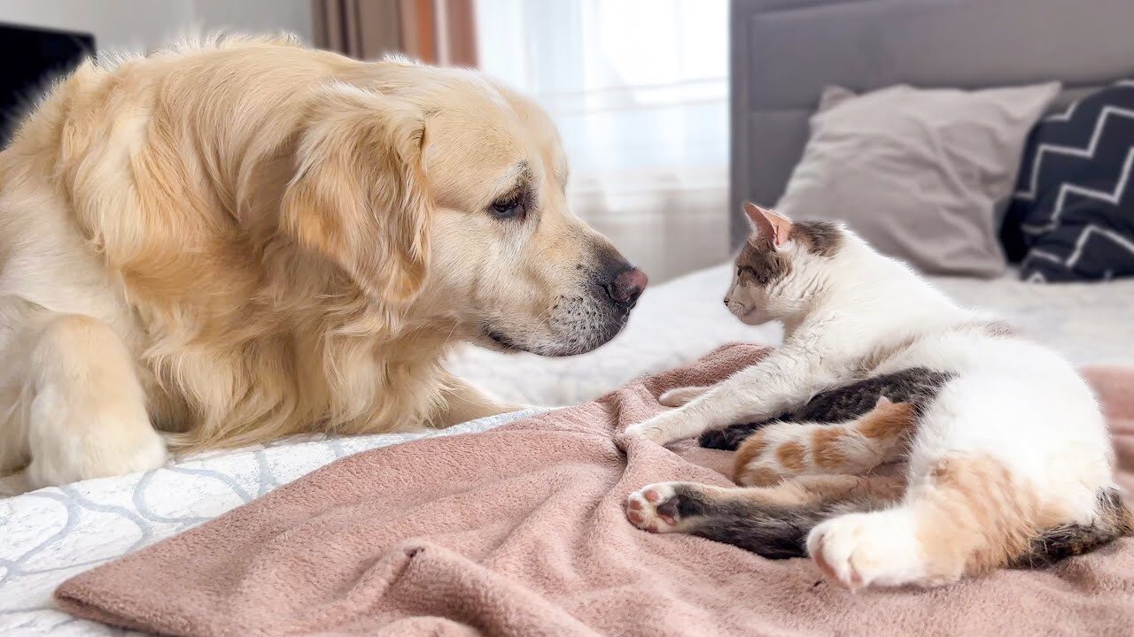種族を超えた友情。今回は、心優しいゴールデンレトリバーのベイリーくんと、生まれたばかりの子猫たちを守る母猫さんとの、心温まる初対面の様子をご紹介します。