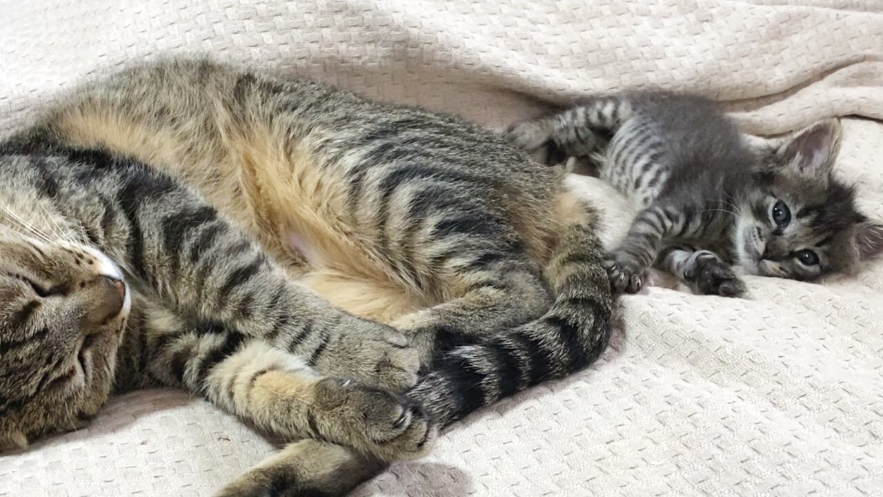 まるで本当の親子のよう!先住猫のヒメにお尻をくっつけて眠る甘えん坊な子猫・テラが愛おしすぎる