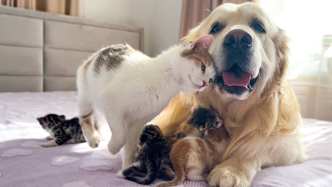 今回の動画では、まだ生まれたばかりの子猫たちを育てるお母さん猫が、あろうことか大きなゴールデンレトリバーの「ベイリー」くんに子守りを託すという、驚きの光景が描かれています。