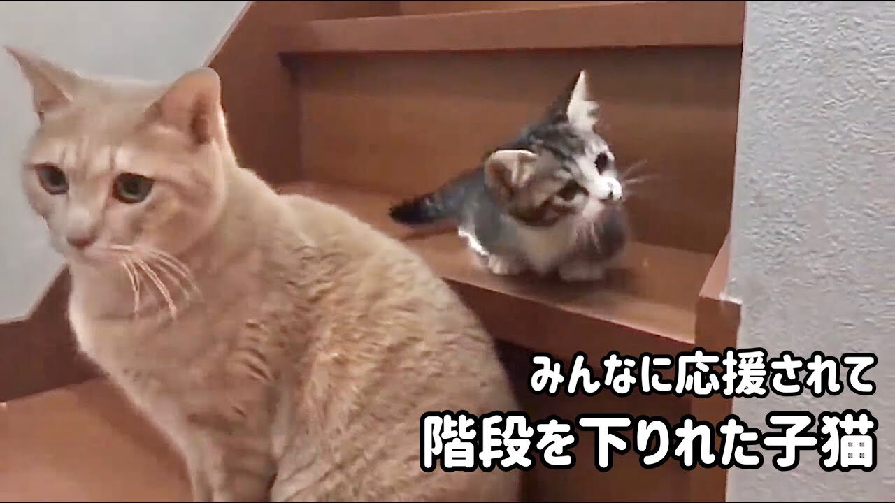 「がんばれ、あと少し!」階段降りに初挑戦する子猫ちゃんと、優しく見守る家族の絆にほっこり