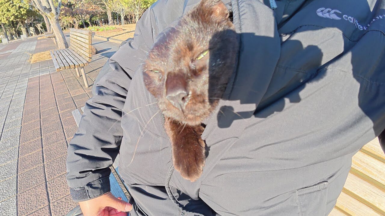 動画は、ベンチに座る飼い主さんのもとへ、黒猫ちゃんがトコトコとやってくるシーンから始まります。 何かを期待するように見つめていたかと思うと、迷わず飼い主さんの上着の隙間に体を潜り込ませました!