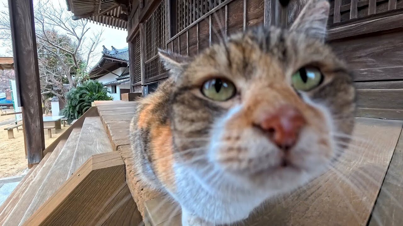 静かなお寺の境内で、一際目を引く三毛猫ちゃん。 YouTubeチャンネル「感動猫動画」から、出会った瞬間に心を奪われてしまう、とっても人懐っこい猫ちゃんの様子をご紹介します!