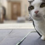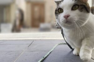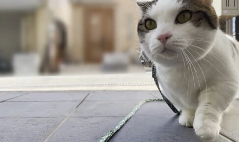 玄関の前で今か今かと待ち構える猫さま、豆大福くん。