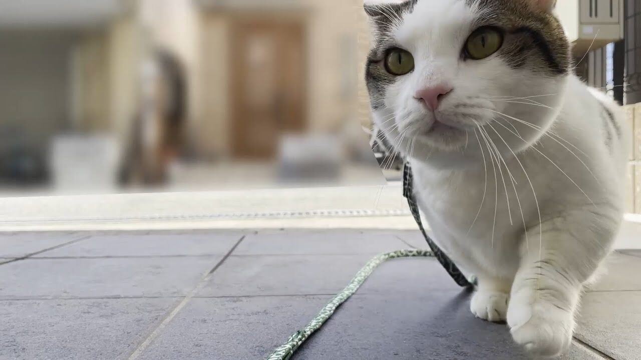 豆大福くんはリードをつけてもらって玄関前で“お外体験”スタート!…と思いきや、結局すぐ家の中へダッシュで避難。