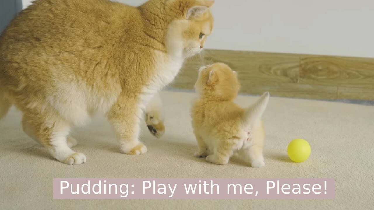 猫じゃらしで遊んでいたのは、ブリティッシュショートヘアのナタリ。ところが、どこかノリが悪くてすぐに飽きムード…。そこへ甲高い鳴き声とともに現れたのが、よちよち歩きの子猫プリンです。