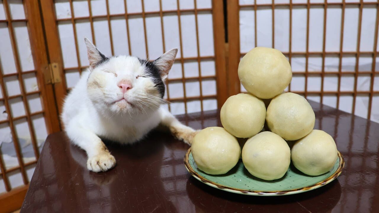 ホリホリが落ち着いたら、丁寧に洗ってストーブでじっくり。甘い香りがしてきた頃には、猫たちも最後までそばでお付き合い。もち皮に包んで、つやつやおまんじゅう完成!“猫つき手作りお彼岸”が尊すぎて、心までほかほかです♡