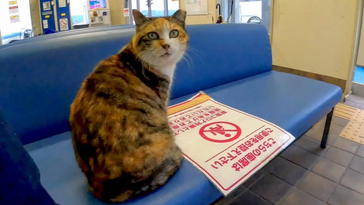 駅の待合室で、ベンチにちょこんと座っていた三毛猫さん。