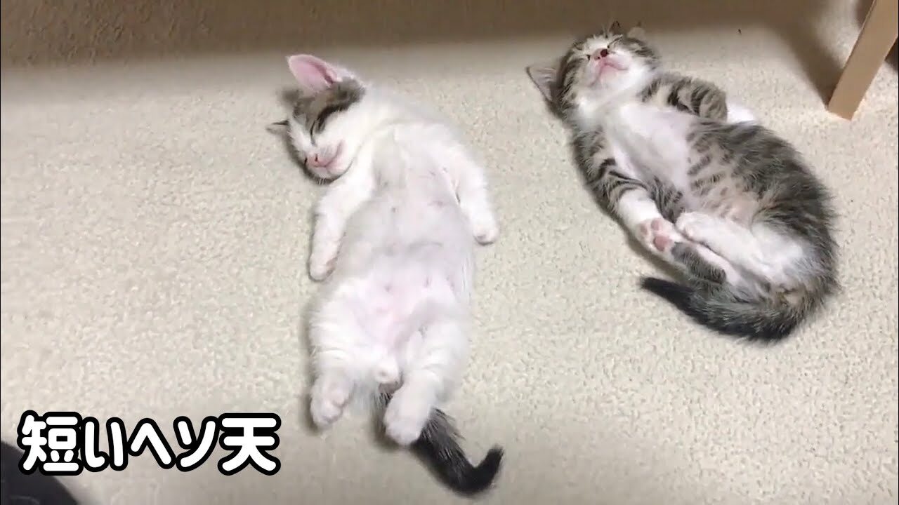 ソファ(床)でゴロン…と思ったら、そのままスッとひっくり返って“へそ天”になっちゃう子猫たち。