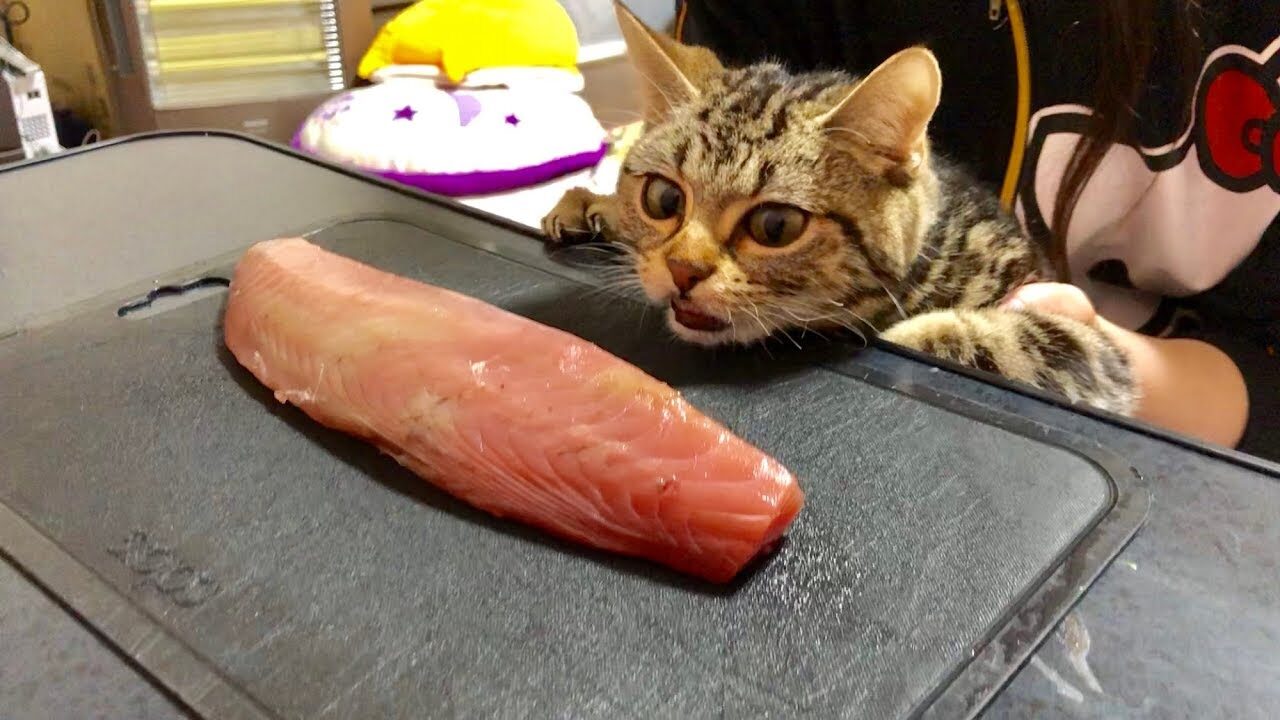 【悶絶】巨大カツオを前に目が本気…待ちきれない「ちょり」のガン見が可愛すぎる♡
