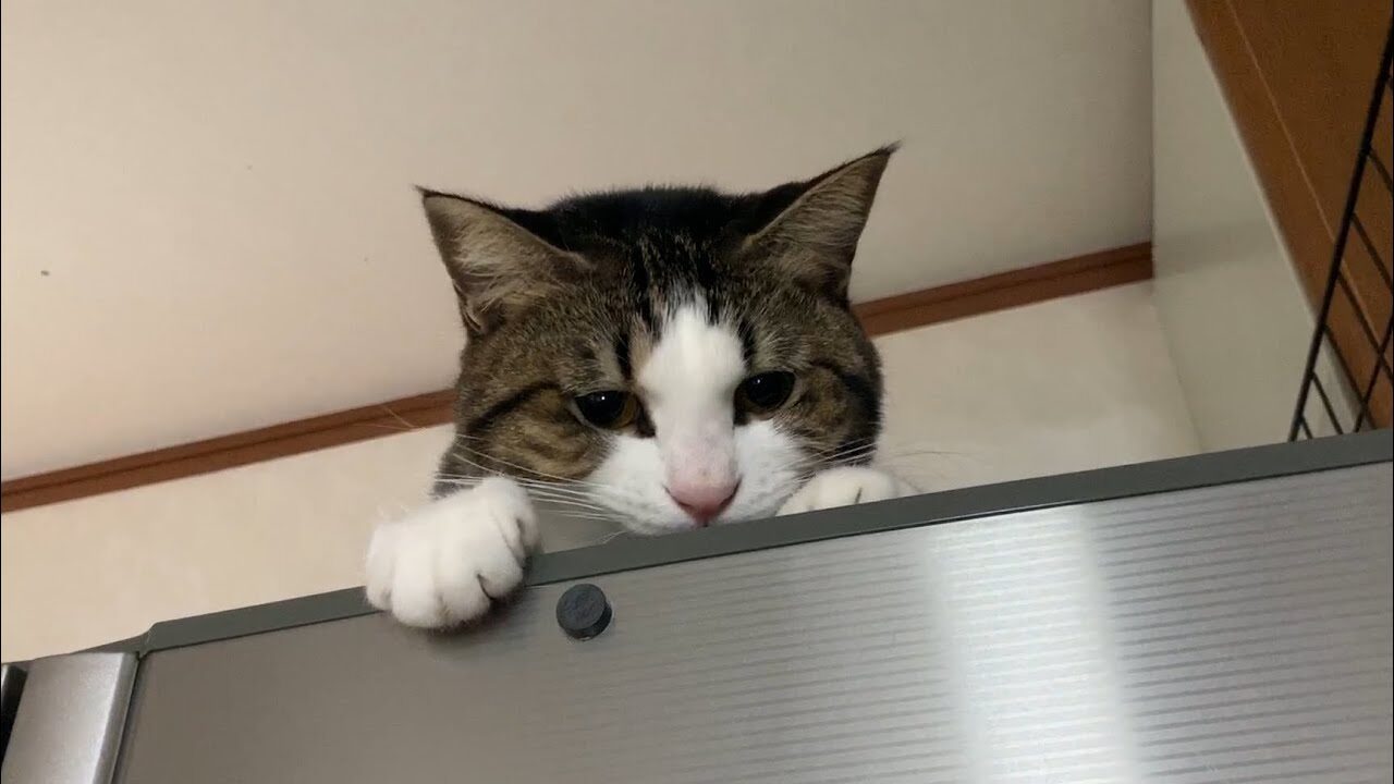 冷蔵庫の上から「助けて〜」とばかりに鳴くオデコ。悲しげな声なのに、上ではくねくね転がってちょっと余裕…そのギャップがたまりません。