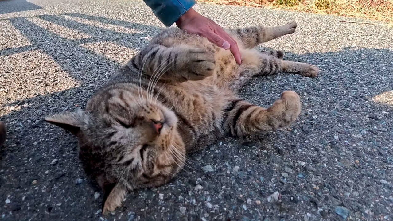 路上で寝転ぶ猫さん、撫でられるとさらにリラックス!