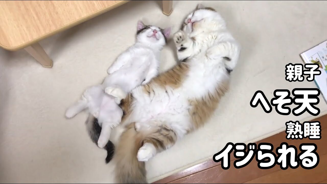 今回ご紹介するのは、パパ猫の秀吉くんと、その息子の豆大福くん。普段から仲良しな親子ですが、今日はなんと親子揃って、見事な「ヘソ天」スタイルで熟睡する姿を披露してくれました!