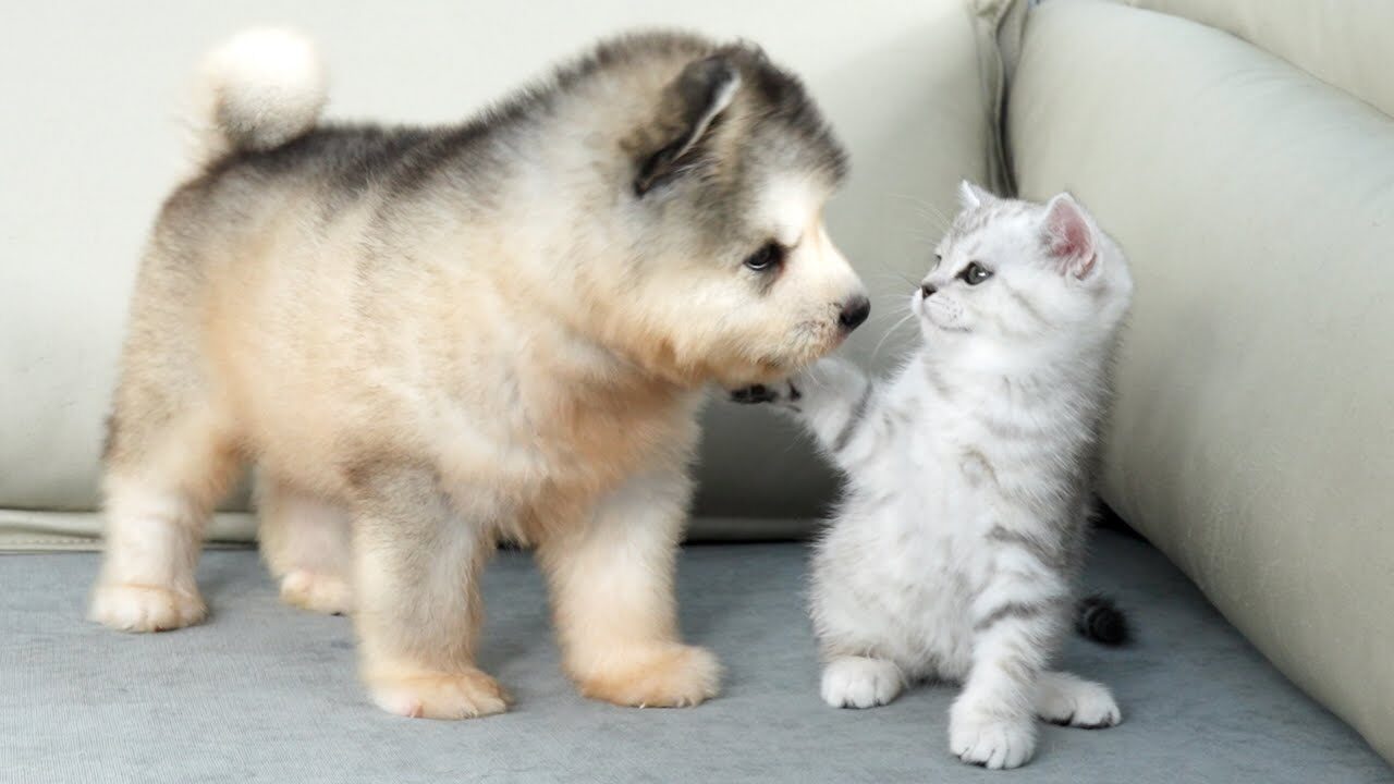 今回お届けするのは、アラスカン・マラミュートの子犬・ラフィーくんと、小さな子猫・エイミーちゃんの、とってもピュアな初対面の様子です。