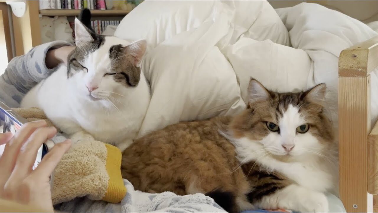 ママがベッドで横になっていると、心配そうに様子を伺いに来る猫ちゃんたち。「どうしたの?」「どこが痛いの?」と問いかけるように、そっと顔を近づけたり、優しく寄り添ったり。特に一匹の猫ちゃんは、ママの胸元にどっしりと乗っかって、全力の「重圧」による看病を開始!ママはちょっぴり「重たい…!」と苦笑いですが、その温もりとゴロゴロ音は、どんなお薬よりも効く最高の癒やしになっているようです。