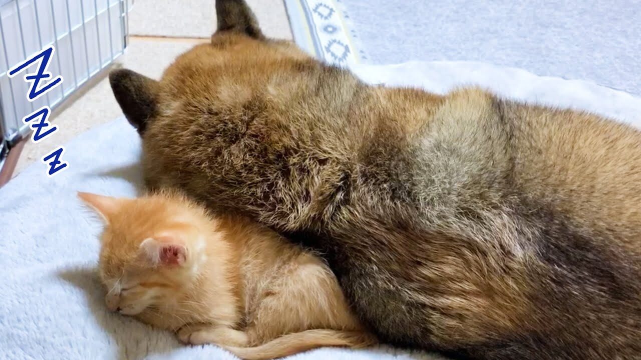 「柴犬さんはボクの大きな枕ニャ♡」自分より大きな柴犬さんにもたれかかって、幸せそうに夢の中へ誘われる子猫ちゃん
