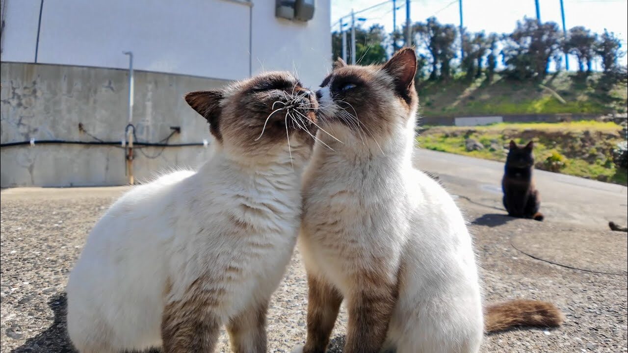 言葉はなくても通じ合う、猫ちゃん同士の深い絆。穏やかな日差しの中で、二匹が作り出す平和で優しい時間は、道行く人々の心をそっと温めてくれる、素敵な贈り物でした。