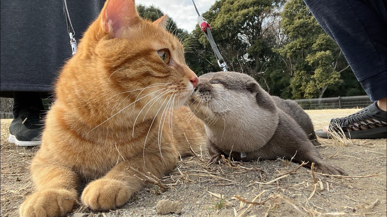 【驚きの絆】カワウソと猫が並走してお散歩!世話焼きお姉さんな姿に癒やされる人続出
