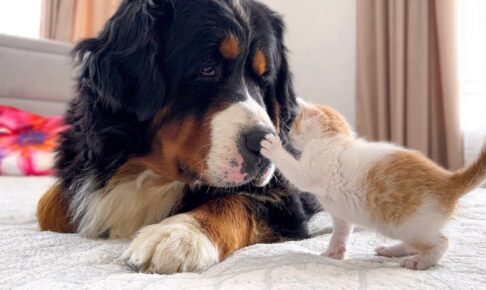 動画では、キジトラの子猫ちゃんと先住猫のむぎくんのやり取りが映し出されており、少しずつ縮まっていく距離感に思わず頬がゆるみます。