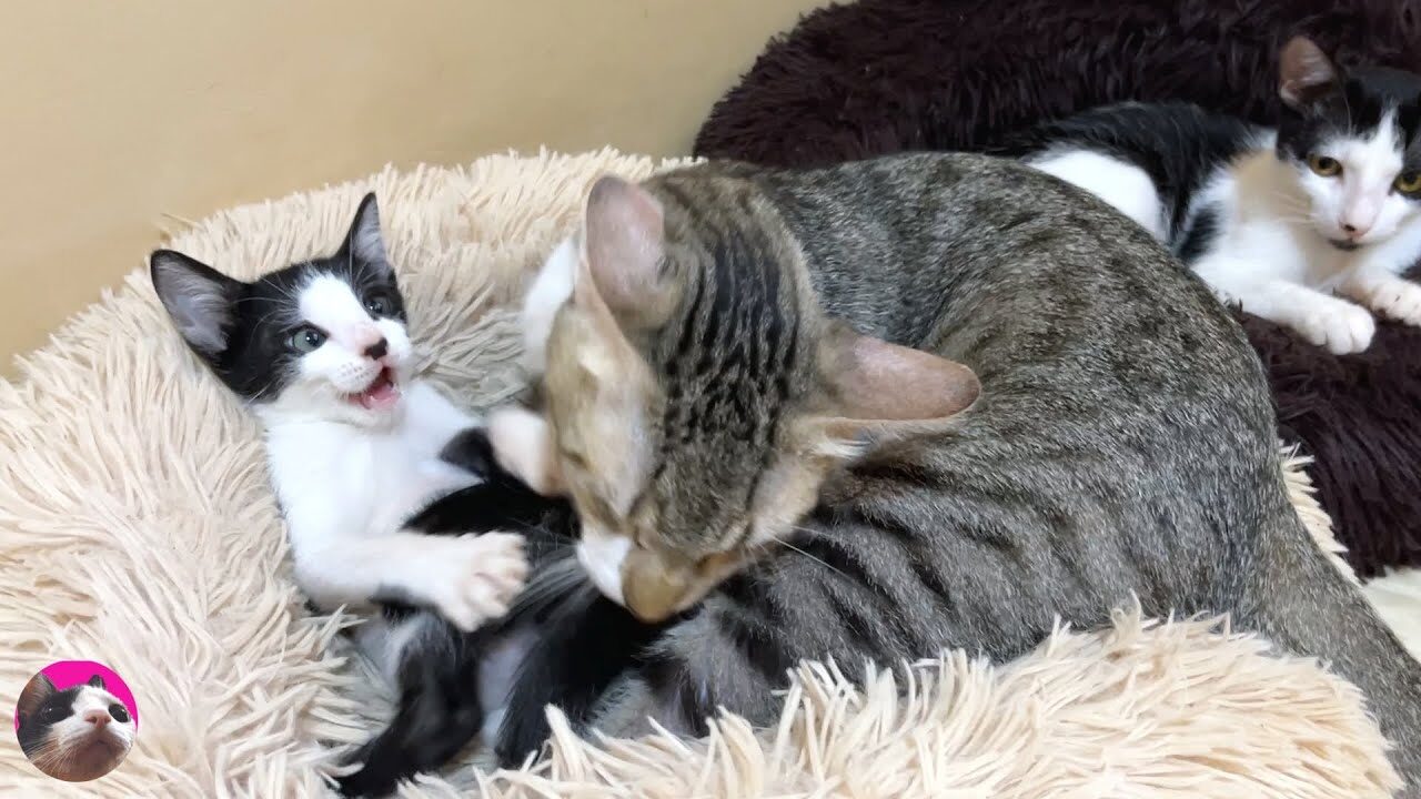 動画では、先住猫たちがミュウちゃんを警戒するどころか、やさしく毛づくろいをしてあげたり、遊び相手になってあげたりと、まるで前から一緒に暮らしていたかのような空気が広がっています。