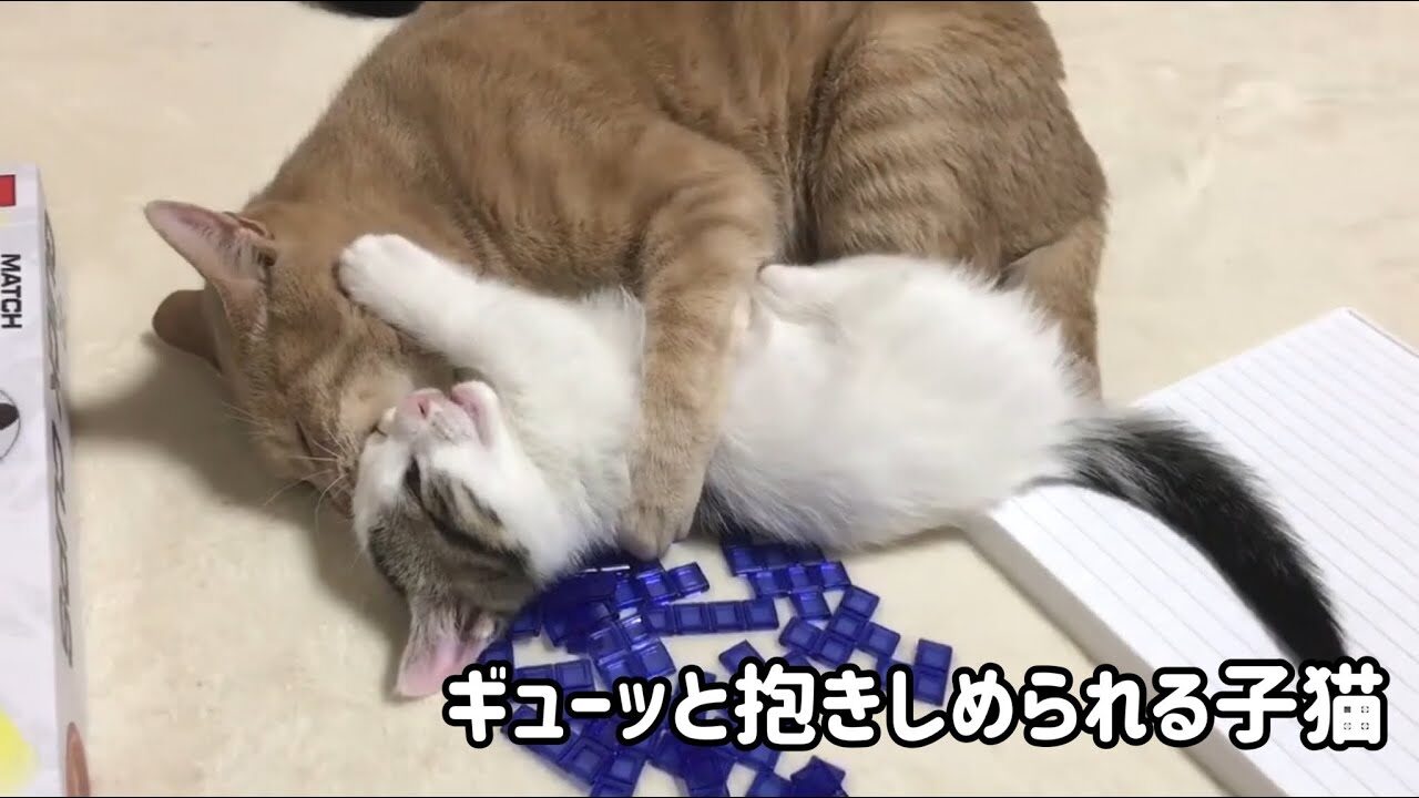 登場するのは、先住猫のひのきちゃんと、小さな子猫ちゃん。動画が始まると、ひのきちゃんは子猫のそばに寄り、まるで本当のお姉ちゃんのように前足でぎゅっと抱きしめます。