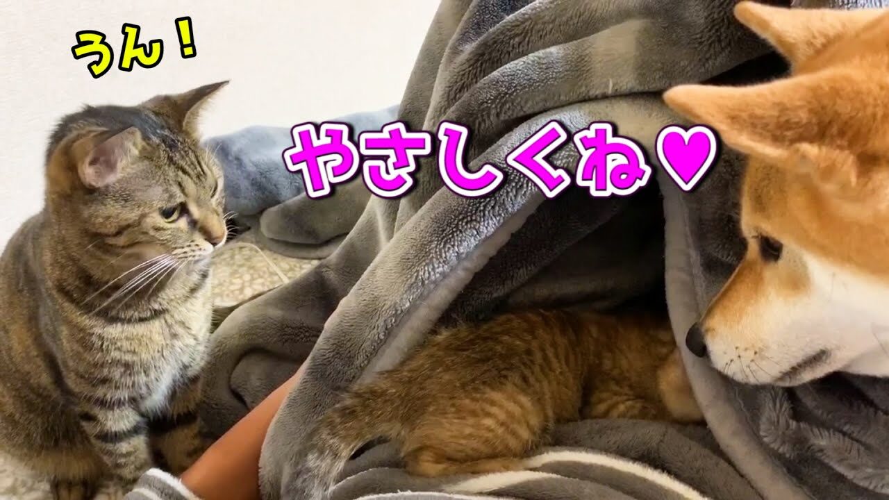 今回ご紹介するのは、YouTubeチャンネル「R村の柴ねこ」に投稿されている動画「柴犬立ち合いのもと、先住猫リリと子猫の直接ご対面♥ Shiba Inu watches a kitten like a mother.」です。