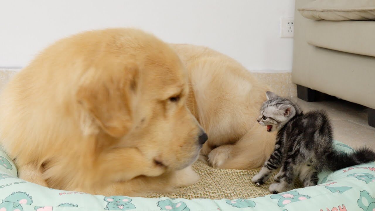 子猫に寝床を取られてショック…それでも優しく受け止めるゴールデンレトリバーにほっこり