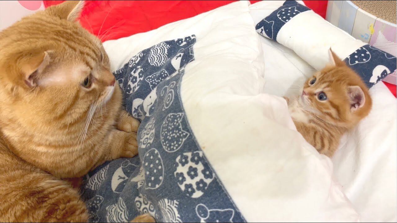 そこへやってきたのは、お父さん猫の「レオくん」。 眠っているぽちゃくんが気になるのか、お布団の周りをウロウロ。 しまいには、ぽちゃくんの寝ているお布団の上に乗っかってしまいました!