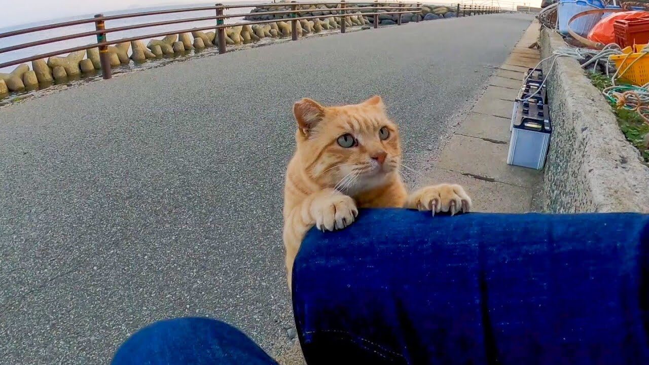 堤防沿いの道端にふと腰を下ろすと、遠くからトコトコと茶トラ猫さんがやってきました。人懐っこいその子は、ためらうことなくスッと膝の上へ。心地よい重みと温かさに癒やされていると、さらに別の猫さんたちも「僕も!」「私も!」と集まってきます。