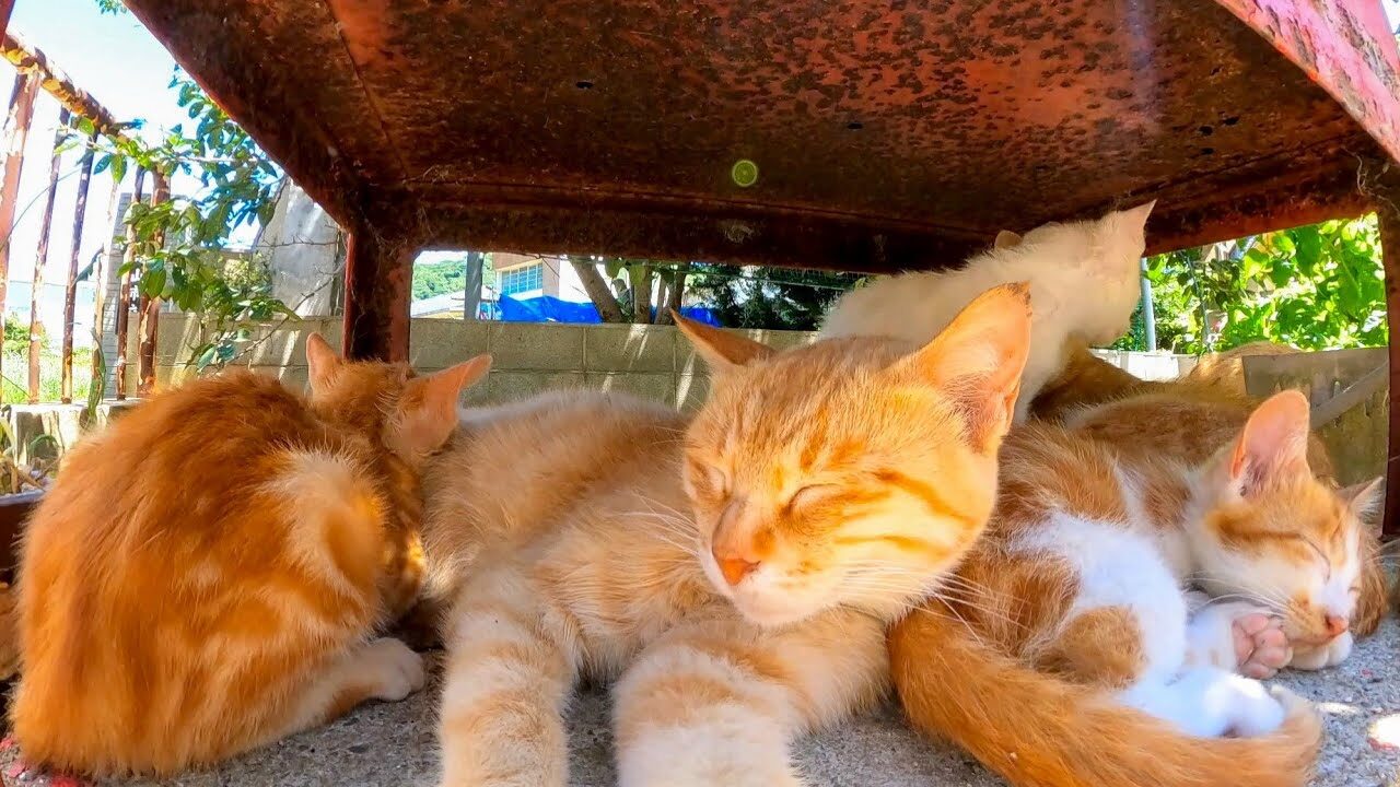 さらに別の猫も合流し、格納箱の下はさらに賑やかに。どんなに暑い日でも、大好きな家族と一緒にいられるこの場所が、彼らにとって一番の安心スポットなのかもしれませんね。