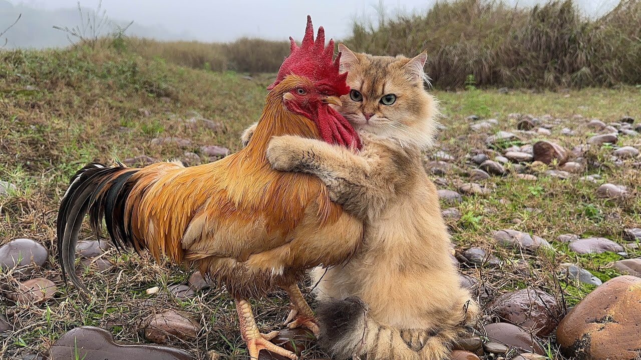 【異種格闘技!?】モフモフ猫と凛々しい雄鶏の不思議な絆♡霧の中の探検デートがシュールで可愛い!