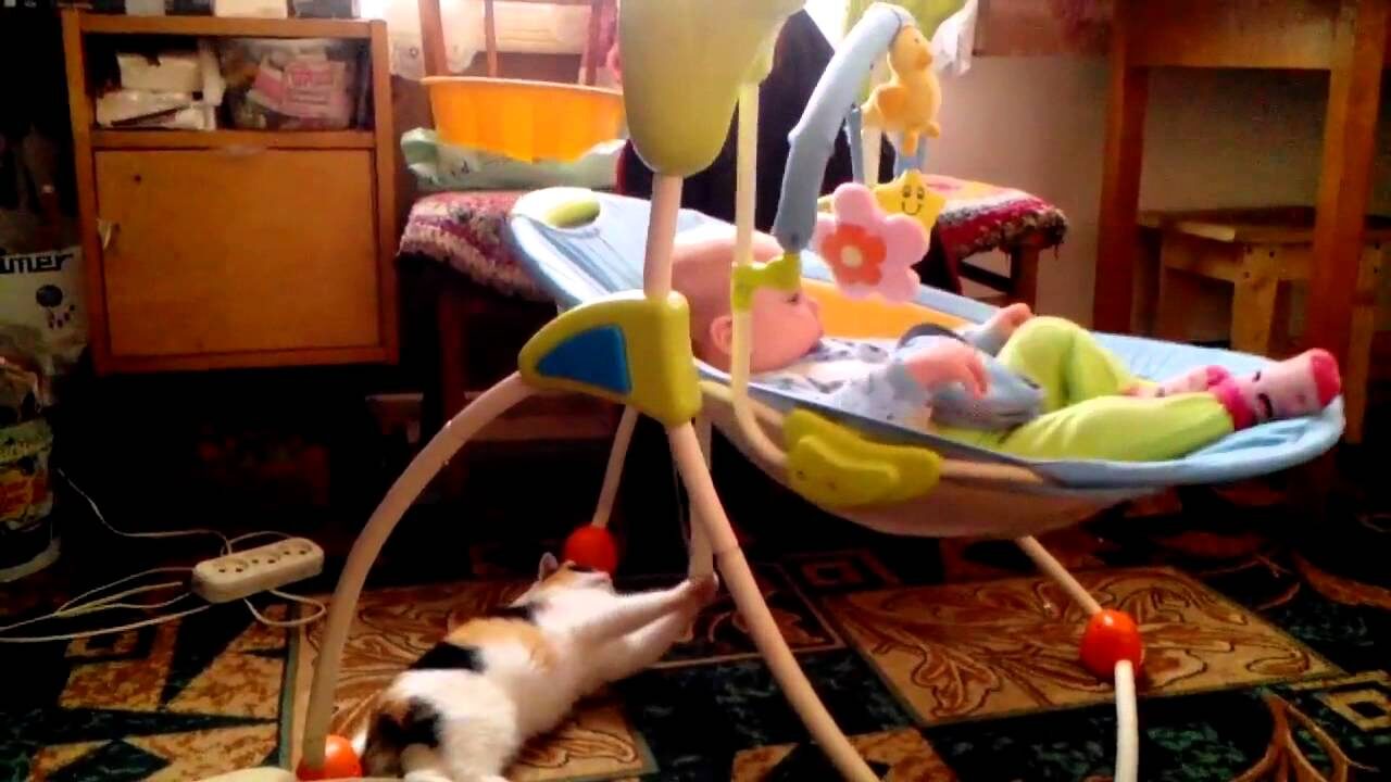 動画に登場するのは、バウンサーでお昼寝中の赤ちゃんと、その下に陣取る一匹の三毛猫ちゃん。驚くことに、この猫ちゃんは自分の前足を器用に使って、バウンサーを「ゆらゆら」と優しく揺らしているのです。