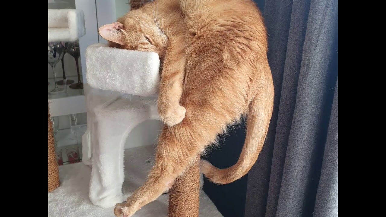 動画に映っているのは、キャットタワーの最上段でスヤスヤと眠る茶トラの猫ちゃん。しかし、そのポーズが驚きです。上半身はベッドに収まっているものの、下半身はタワーの支柱に沿って真っ直ぐ下に伸びた、まさに「垂直」な状態!