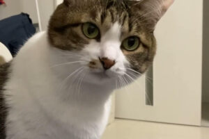 飼い主さんの足元で鳴いているキジ白の子猫がいます。