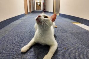 途中で母猫がやってきて犬達の視界を塞ぐと、え?見えないんですけど?とばかりにハスキーは慌てます。