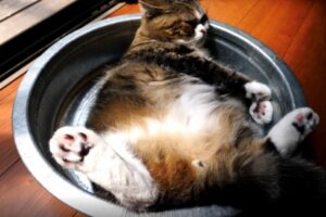 茶トラの大きな猫がお父さんの膝の上で顔を少し埋めて爆睡中です。どうやらイビキまでかいています。耳をすませていると、リズミカルなイビキについつい笑いが出てしまいます。こんなにぐっすり寝ていると飼い主さんも動きたくても動けませんね。