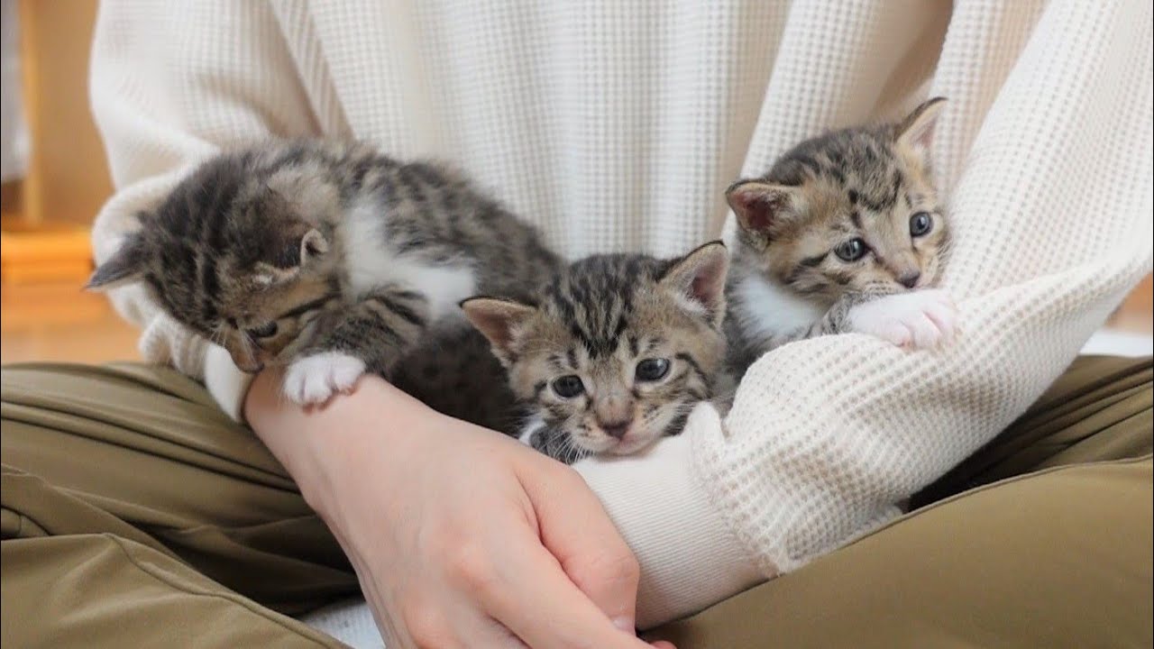ご飯を食べて満腹になった子猫達は飼い主さんの膝の上へとまっしぐら。