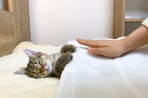 猫の方が圧倒的に力では強いはずなのに、こんなに小さなあひるの子供にしてやられてしまっています。違う子猫がベッドの中に入ってきましたが、この子はさきほどの黒白の子猫よりは少しだけ勇敢です。