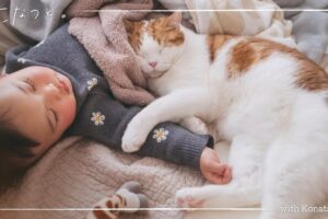 少し毛が長めの三毛柄の子猫がぐっすりと寝ているところに飼い主の女性が、おきなさ〜いと優しくお腹を撫でてあげています。全体的に白地に三毛柄が入っている子猫ですが、肉球は黒くてツヤツヤとしています。