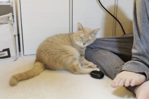 そこへもう一匹の茶トラ猫がやってきて、2匹の間に体をねじこもうとしています。もしかしたら3兄弟なのかもしれません。間に入るどころか、右側に寝ていた猫の体の上にどっかりと腰を下ろしてしまいました。