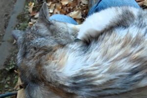 その後、子猫は大きな部屋に出してもらってヒメちゃんのあとをくっついて行動しています。眠くなってベッドの上で寝るヒメちゃんの横で、少し離れて一緒に寝ている子猫です。まだ距離は少しありますが猫団子が見られるようになるのもすぐでしょうね。