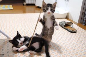 大きな声で必死に鳴き続ける子猫が不憫でたまらなくなります。そこへ先住の保護猫さんのチャットちゃんが子猫をなだめようとダンボールのなかに顔を突っ込んでいます。助けてにゃ〜という子猫からのSOSの声を聞いてたまらなくなったのでしょう。