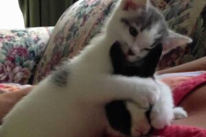 でも一旦膝の上に乗っかってしまえばあとは背中をポンポンたたいてもらって夢見心地になっています。男の子の猫さんの場合は女性にべったりというコが多い中で、リキちゃんは男性であるお父さんにべったりなのですね。